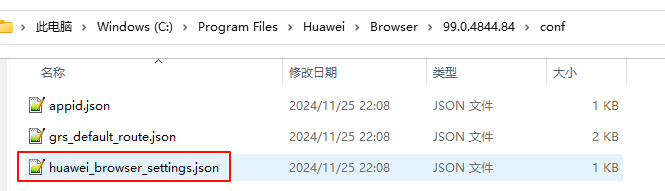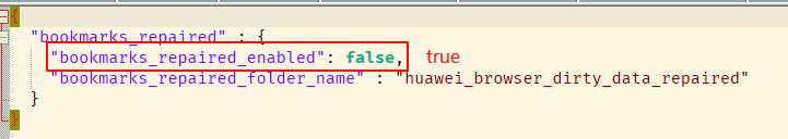 1. 关闭华为浏览器,使用记事本或其它文本编辑器打开位于安装路径下(默认是:C:\Program Files\Huawei\Browser\99.0.4844.84\conf)的配置文件“huawei_browser_settings.json”,将字段“bookmarks_repaired_enabled”的值置为“true”并保存。