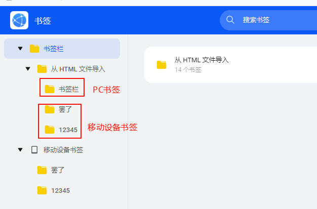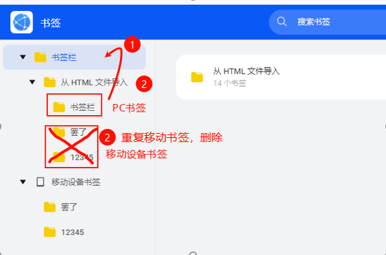 由于导出书签会将“书签栏”以及“移动设备书签”(如果有)一同导出,再导入后会将“移动设备书签”复制了一份放到“从HTML文件导入”下“书签栏”的同级目录中,见上图,选择删除即可。