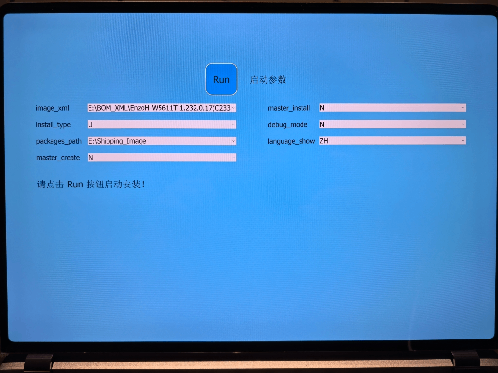 进入如下界面后,除了语言选择中文(language_show选择ZH),其他不用修改,点击Run开始系统封装和重装。